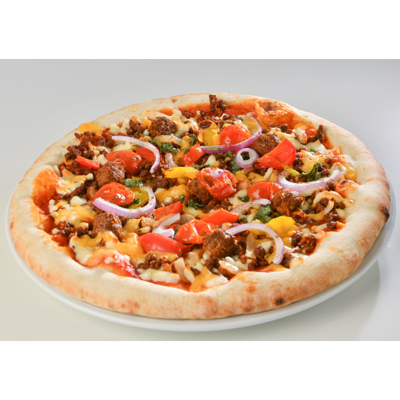 Base de pulpe de tomate, mozzarella, bœuf au saté (satay contient des arachides), cheddar et emmental, poivrons, oignon, filet de piment Siracha, basilic frais, tomate cerise