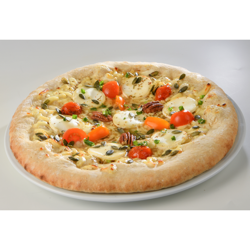 Base de crème, crème fraîche d’Isigny, mozzarella, fromage de chèvre, filet de miel de Lune de miel, graines de tournesol, noix de Pécan, basilic frais, tomate cerise