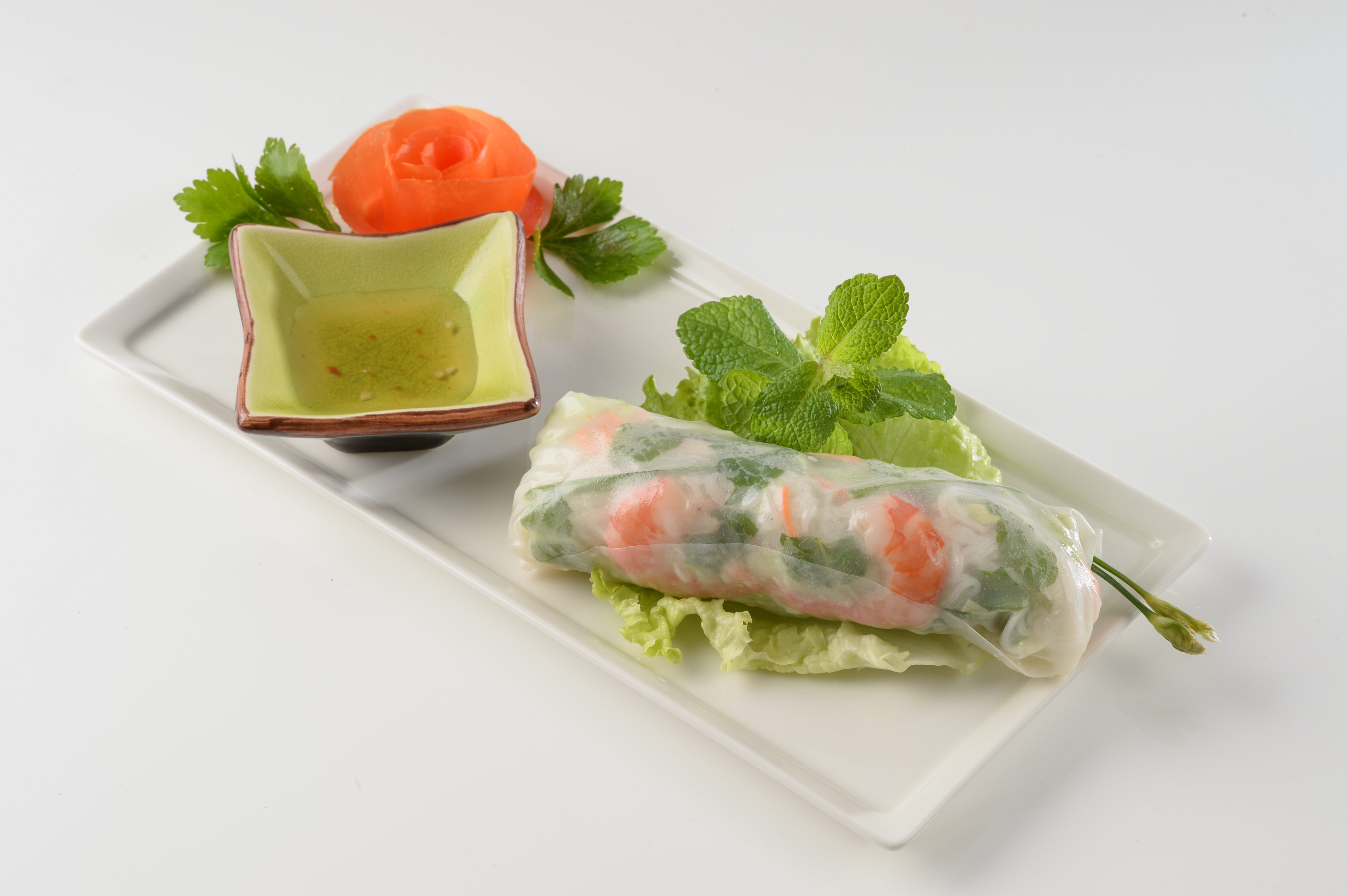 Disposer les rouleaux de printemps dans un plat de service avec des coupelles de sauce.§